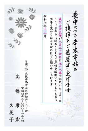 銀の箔押し加工を施した、きらびやかで高級感のある喪中はがきです。