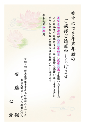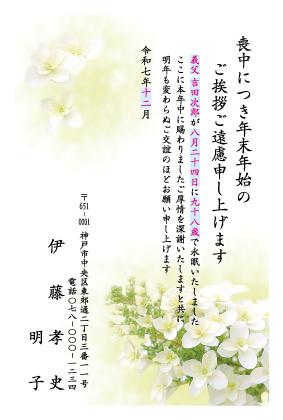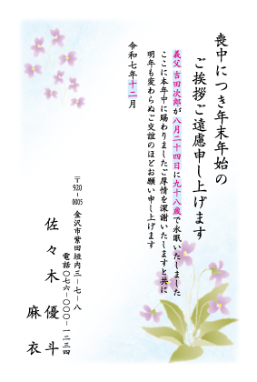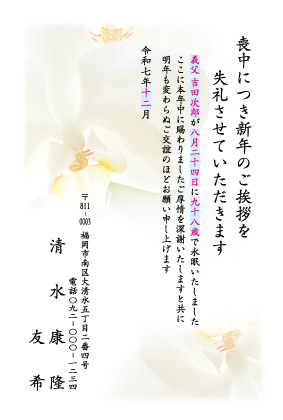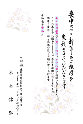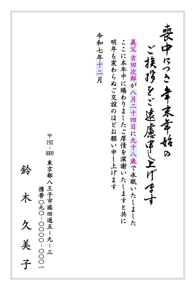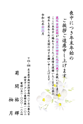 故人の情報(続柄・故人名・ご不幸月・亡くなられた歳)を入れることができる一般的なタイプの喪中はがきです。